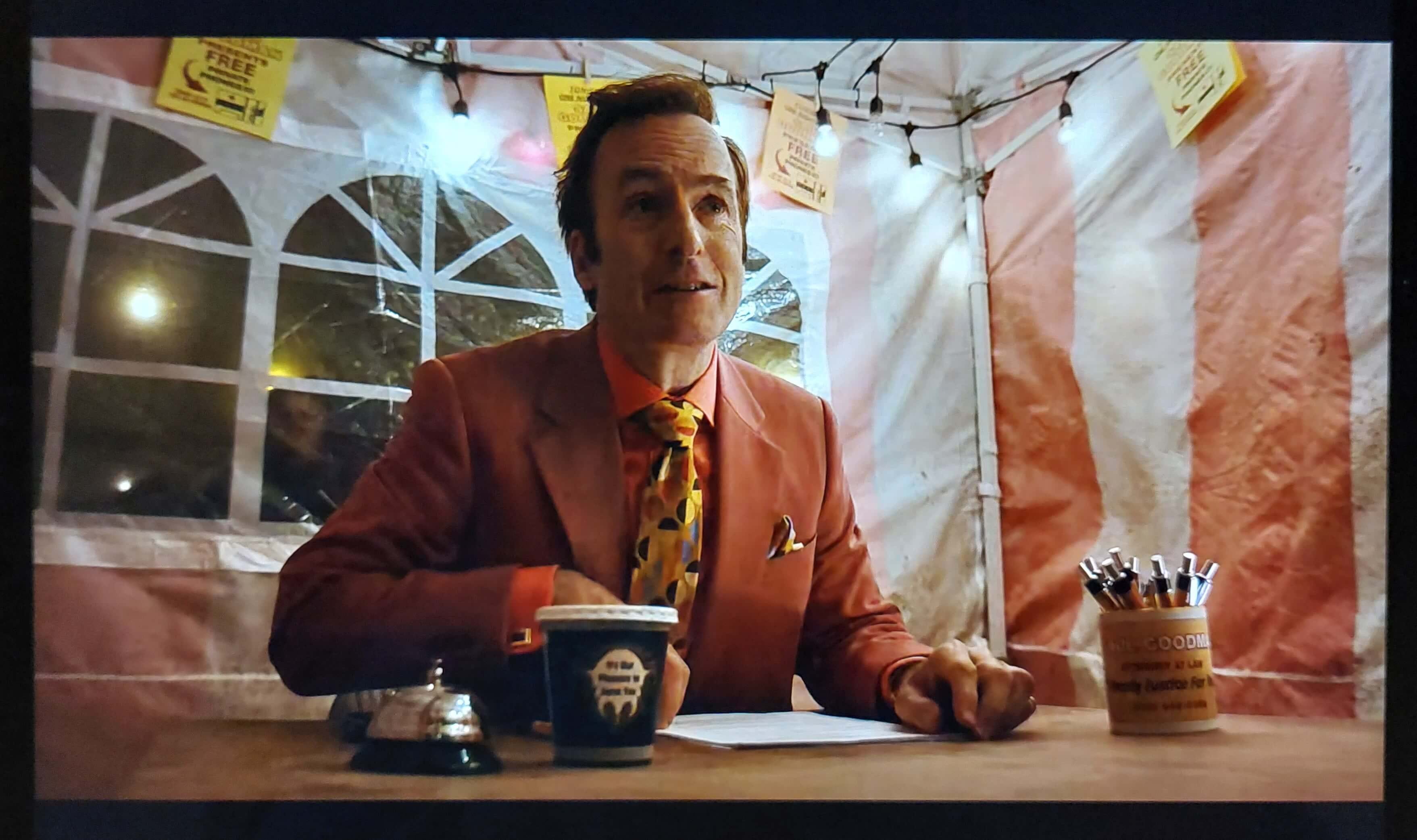 This has such an impact because throughout the rest of the show, and in Breaking Bad, so much of Saul's world is about color. From his garish suits to his colorful ties, to his outlandish shirts.