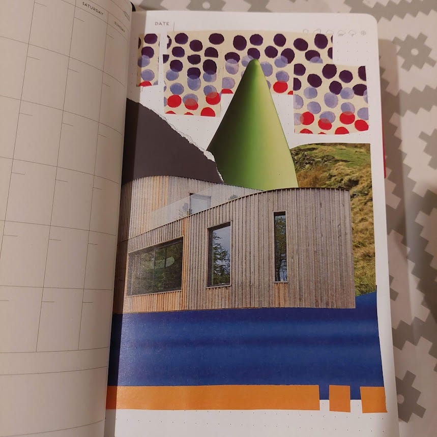 Turns out Collage hits for me on a number of levels. I can recycle any old scrap of paper in the house, I can collect interesting bits and pieces, I can assemble a Collage without much effort (not the best at drawing as much as I try), and the end result is something tangible.