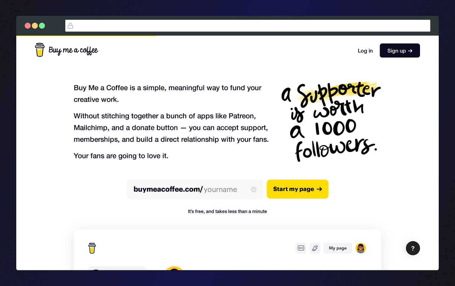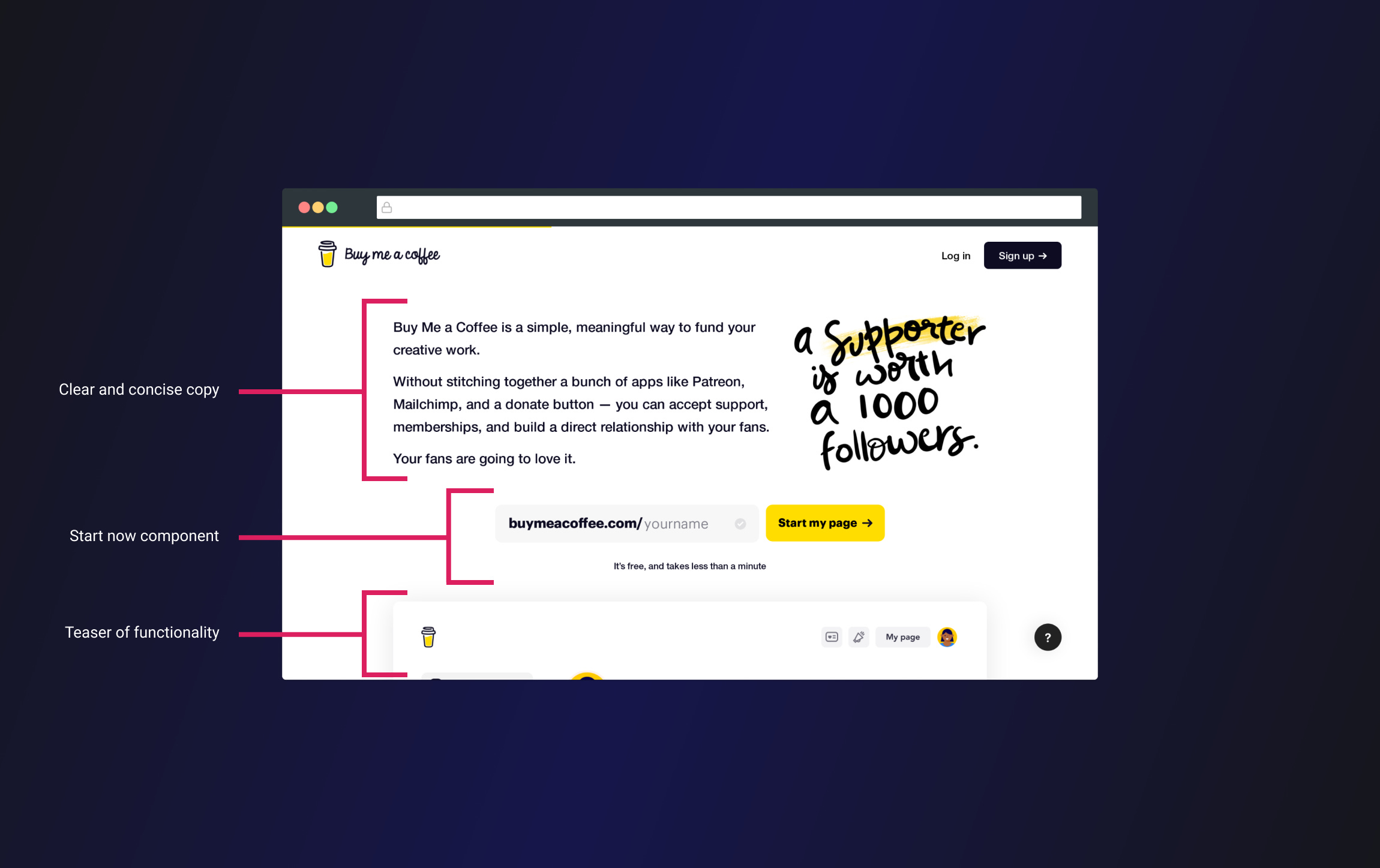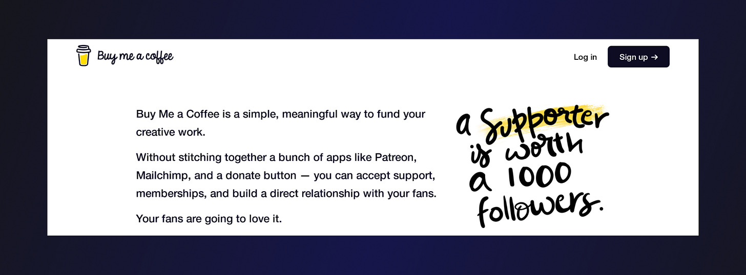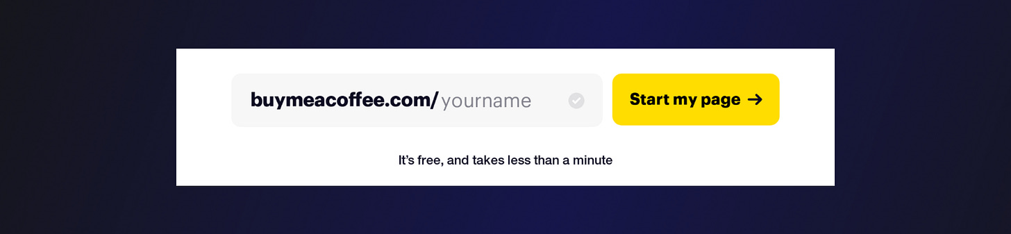This week, let's look at the hero section of the Buy Me A Coffee landing page; specifically the hero section.