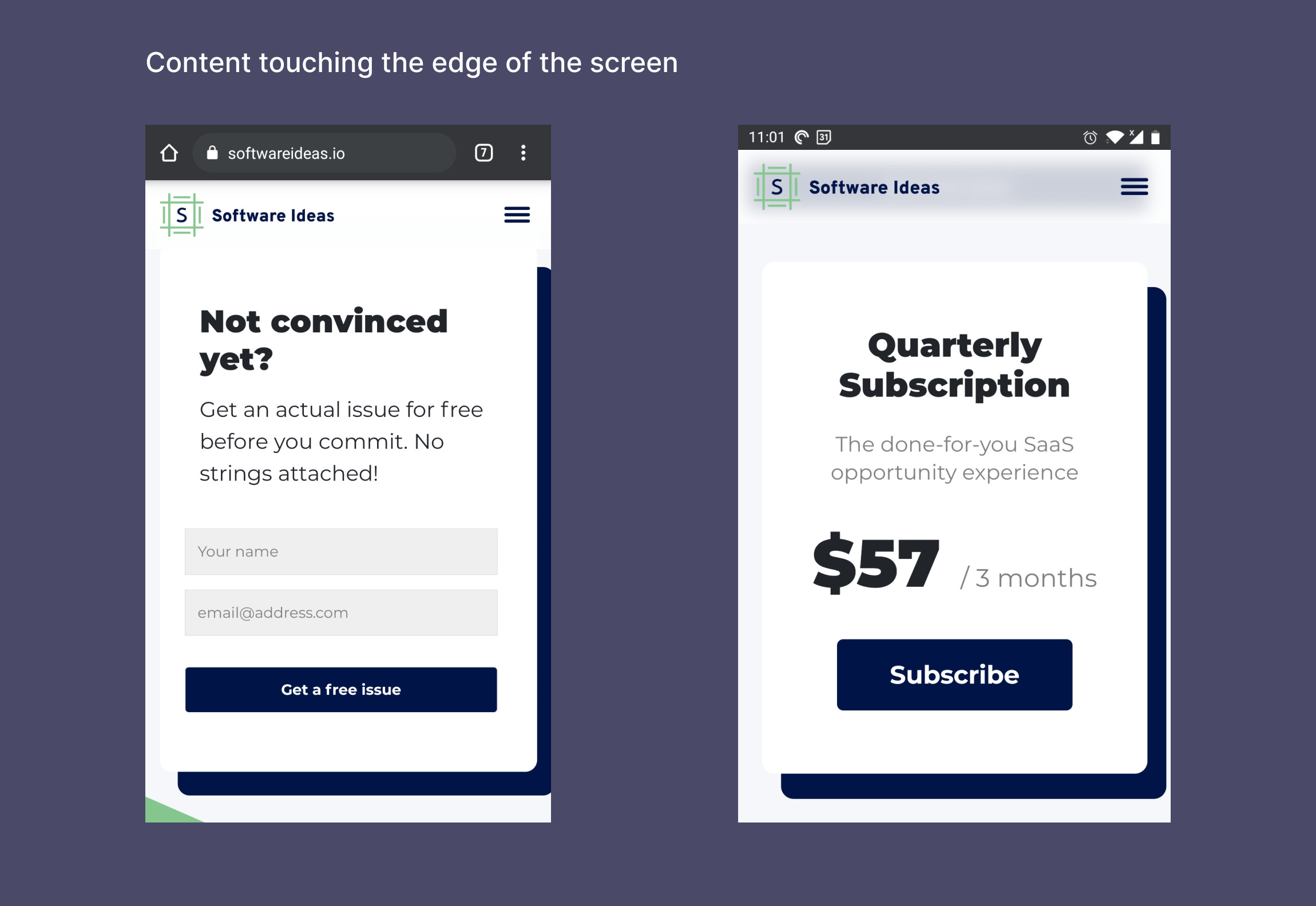 Always examine your website on mobile to make sure content is brought in from the edge of the screen.