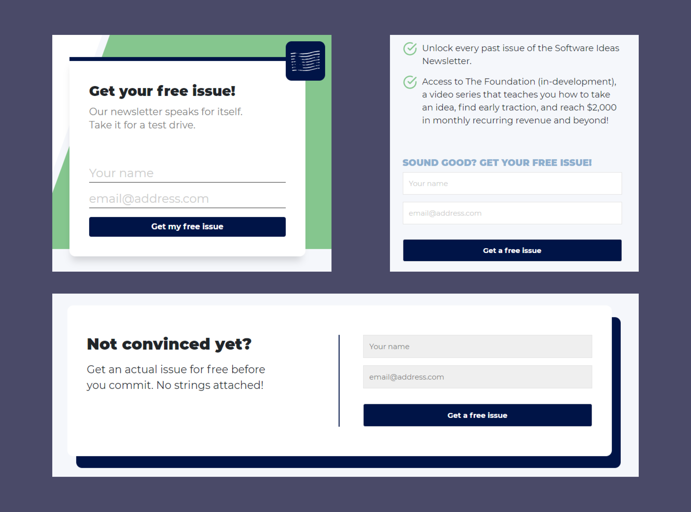The repetition of this sign-up call to action does a good job of encouraging the user to sign-up and get their free issue of the newsletter.